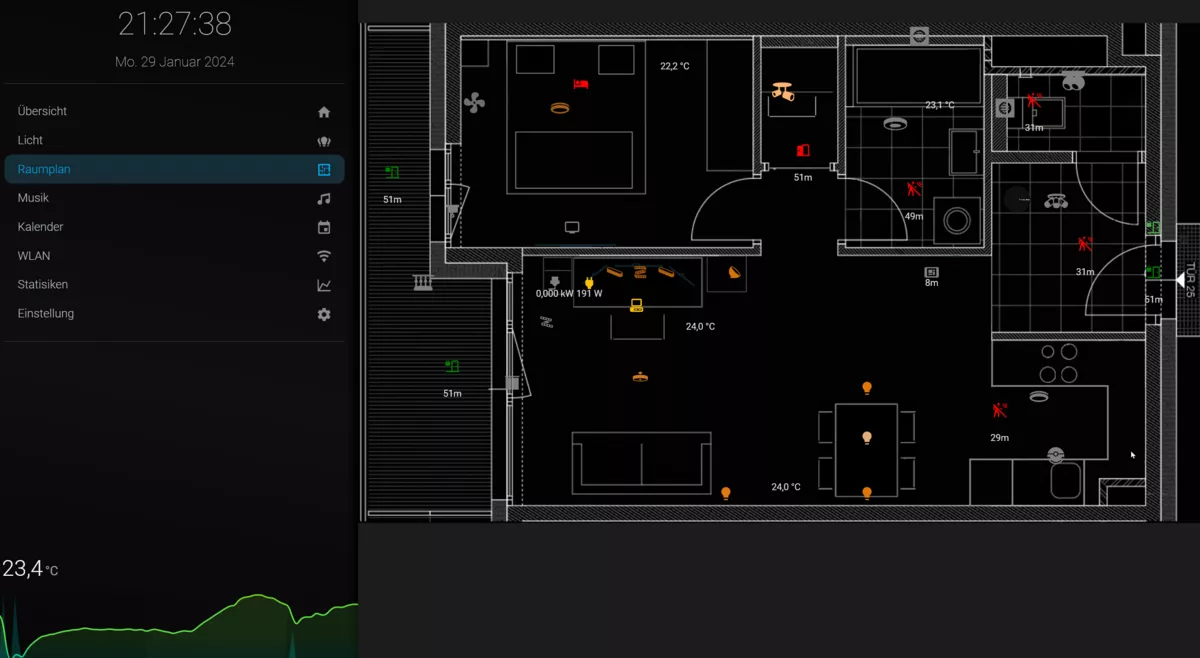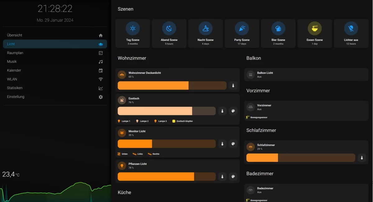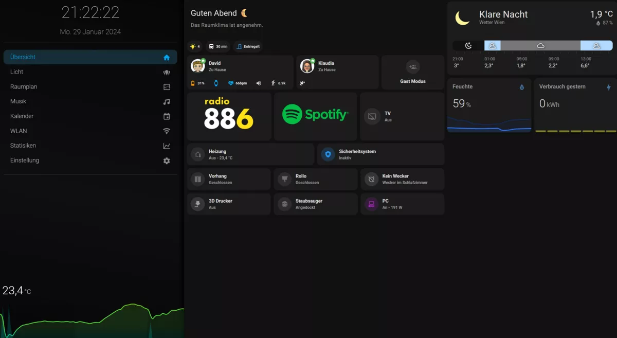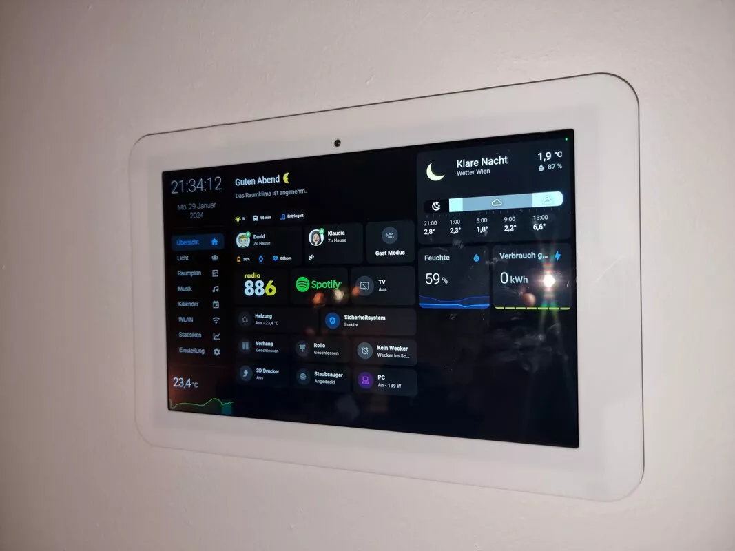 I have created a dashboard in Home Assistant that allows me to monitor and control my Smart Home devices. It has a clean and simple design, and it is easy to use. Home Assistant allows you to customize your dashboard however you want. You can add widgets, change the layout, and even create your own custom widgets. You can also create multiple dashboards for different rooms or purposes. I put my dashboard on a cheap Samsung Tab A8 tablet that I mounted on the wall in my living room using a self-made 3D printed mount that you can find on my Thingiverse page here. I put an AC Socket with a USB charger behind the tablet so I can charge it without having to remove it from the wall. It allows me to control my Smart Home devices from anywhere in my house, and the screen turns on automatically when I stand in front of it thanks to the Fully Kiosk Browser app running on the tablet.