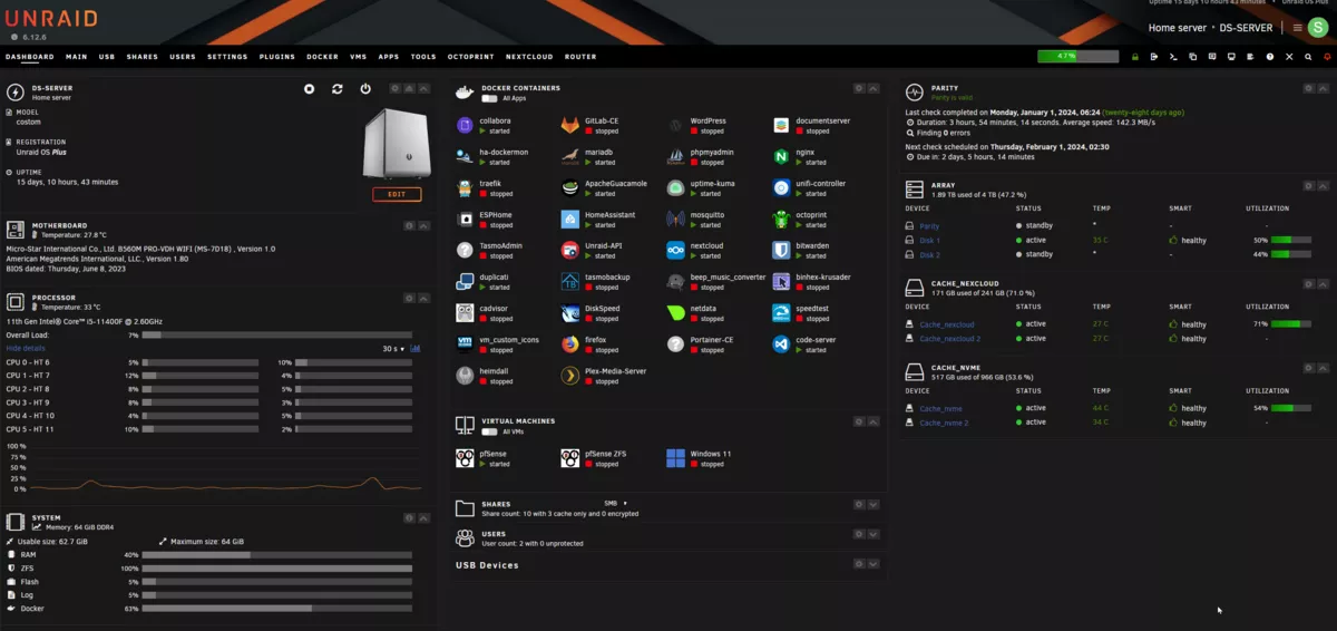 Here is a screenshot of my Unraid Dashboard for a quick overview of my system and things I currently run on it: